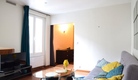 This well-maintained one-bedroom apartment spans approximately 29 sqm and is located on the 2nd floor of a charming old building without an elevator. The living room is thoughtfully furnished with a three-seater sofa, a coffee table, and a flat-screen TV, creating a cozy and inviting space to unwind.